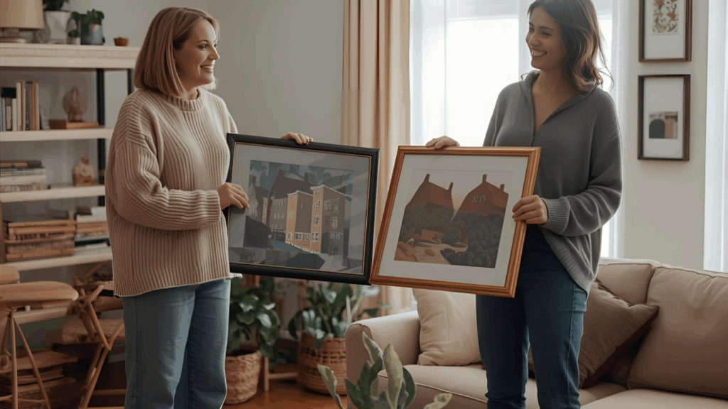 Zwei Pakete, zwei glückliche Menschen, beide haben ein neues Kunstwerk an der Wand.